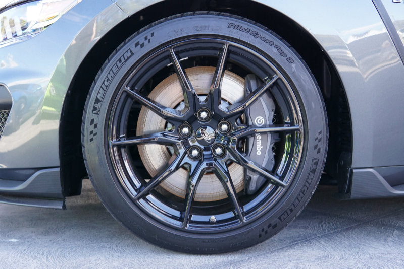 To match the power, Brembo front and rear calipers with smooth, two-piece, highly engineered brake rotors rein in the beast below the hood. The front rotors measure 394 mm and in the back they’re 380 mm. The rotors use aluminium hats to help cut overall weight. The rotors are designed to store and dissipate braking heat - even during track use!